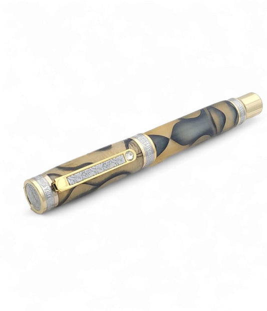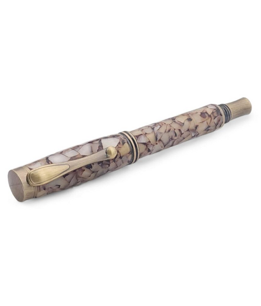עט נובע בעבודת יד בסגנון רטרו - עם שבבי צדף בגוונים טבעיים ועטיפת מתכת מוזהבת