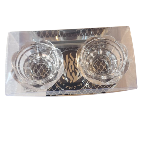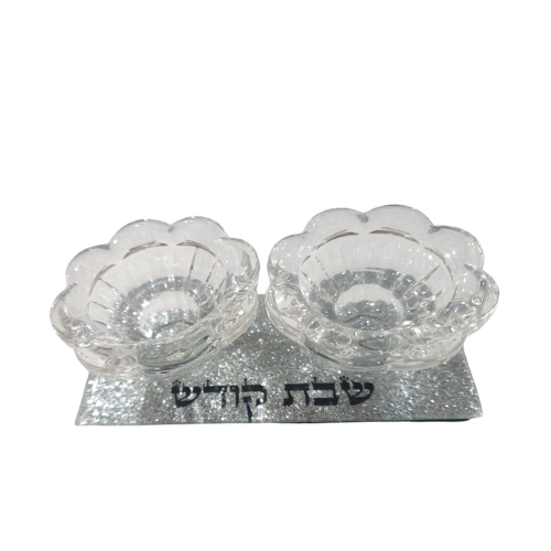 פמוטי זכוכית עם בסיס כסוף מנצנץ וכיתוב שבת קודש